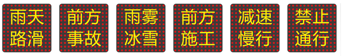 內(nèi)置固定警示語句:1.雨天路滑 2.前方事故 3.雨霧冰雪 4.前方施工 5.減速慢行 6.禁止通行